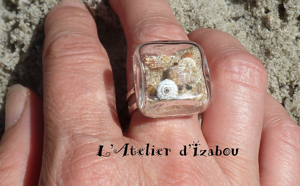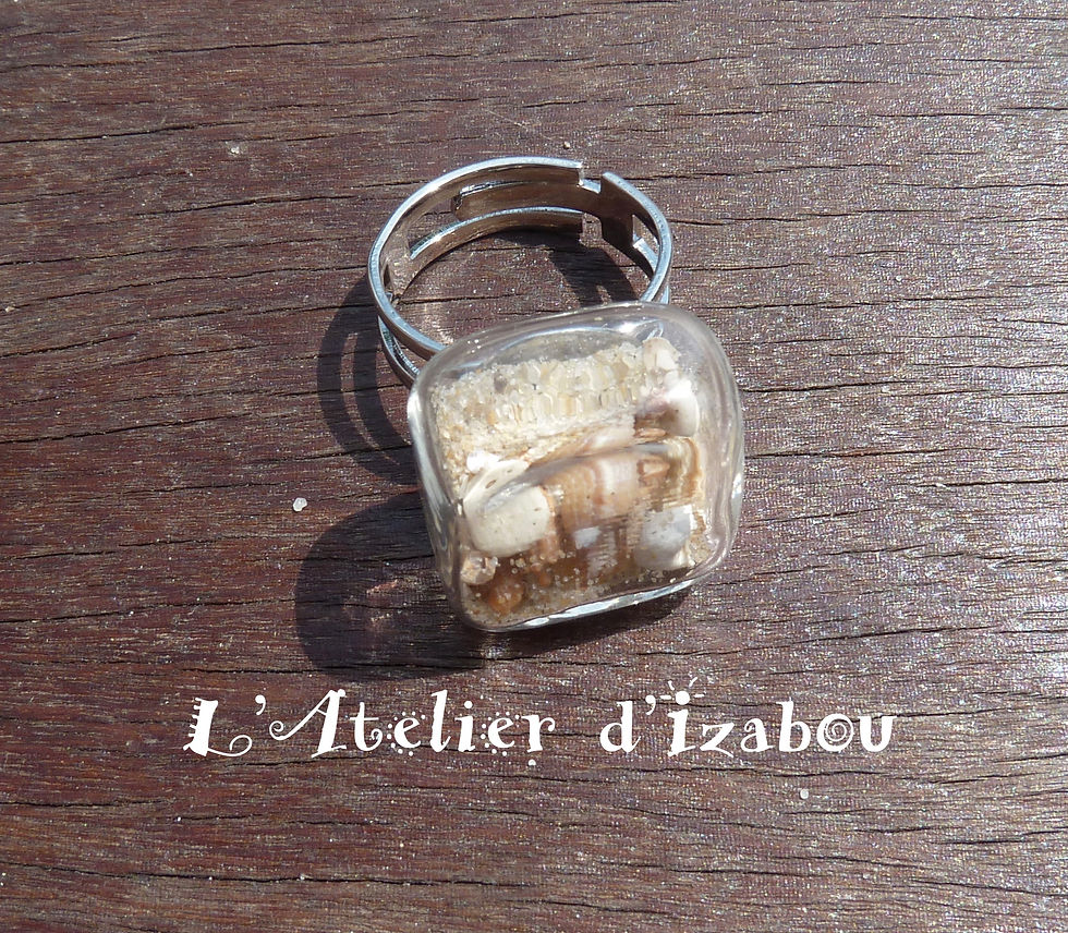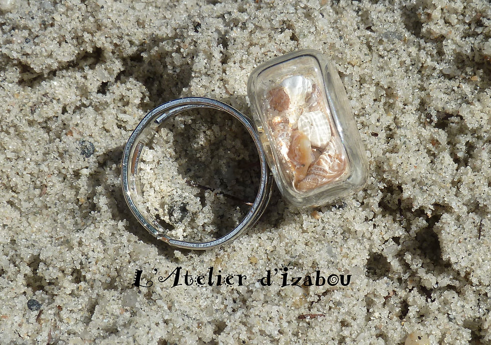 Récoltés avec mes filles, les coquillages et le sable de cette bague transparente en verre donnent un air de vacances à nos mains hâlées !